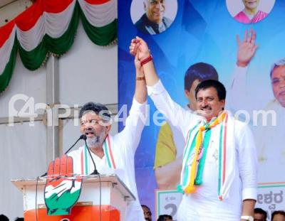 Photo Caption : DCM DK Shivakumar and Congress Candidate CP Yogeshwar during the public meeting for Channapatna by-pol election campaign, in Channapatna on Monday 11th November 2024