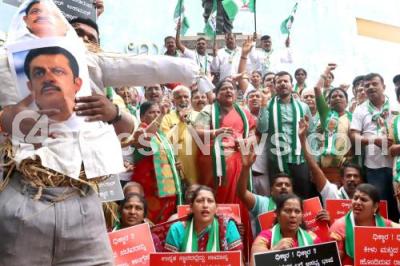Members JD(S) protesting against Congress Minister Zameer Ahamed Khan for his derogatory statement on Union Minister and JD(S) leader HD Kumarswamy, in Bengaluru on Wednesday 13th November 2024
