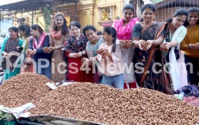Photo Caption : People buying groundnuts during the Kadlekai Parishe (Groundnut Festival) as part of Karthika Masa at Kadu Malleshwara Temple, in Bengaluru on Friday 15th November 2024