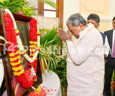 Photo Caption : Chief Minister Siddaramaiah garlanding the portrait of Former PM Indira Gandhi on her birth anniversary at the Vidhana Soudha Conference, in Bengaluru on Tuesday 19th November 2024