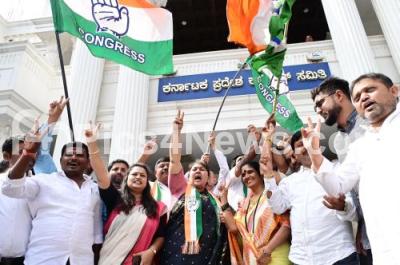 Congress leaders celebrate the victory in the by polls Channapatna, Shiggaon and Sandur elections at KPCC, in Bengaluru on Saturday 23rd November 2024