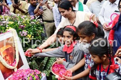 Photo Caption : Minister Lakshmi Hebbalkar and Children offering floral tribute to Former PM Jawaharlal Nehru portrait during the Children Day 2024 celebrations at Bal Bhavan, Cubbon Park, in Bengaluru on Friday 29th November 2024