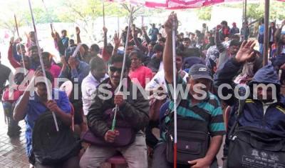 Event Description : Members of National federation of the blind protest against the state government with regard to reducing 80 percent budget of several schemes for empowering different disabilities at Freedom park, in Bengaluru on Monday 2nd December 2024