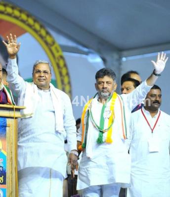 Chief Minister of Karnataka Siddaramaiah and KPCC President and DCM DK Shivakumar during the Congress Jana Kalyana Convention in Hassan on Thursday 5th December 2024