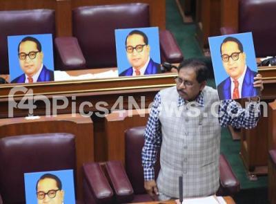 Photo Caption : Home Minister Dr. G Parameshwar holding Dr. BR Ambedkar portraits to protest against Union Home Minister Amit Shah remarks on Dr BR Ambedkar during the Assembly Session at Suvarna Soudha, in Belagavi on Thursday 19th December 2024