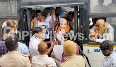 Photo Caption : Police personnel detained the members of Bengaluru City Youth Congress during thier protest against Union Home Minister Amit Shah remarks on Dr BR Ambedkar, in Bengaluru on Thursday 19th December 2024
