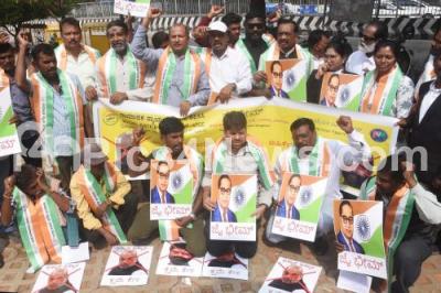 Photo Caption : Members of Social Justice Department KPCC protesting demanding the resignation of Union Home Minister Amit Shah for his remarks on Ambedkar, and BJP MLC CT Ravi for using derogatory remarks against Minister Lakshmi Hebbalkar,at Freedom Park, in Bengaluru on Monday 23rd December 2024