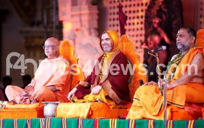 Photo Caption : Sri Subudhendra Teertha Swamiji of Mantralaya with Sri Raghaveshwara Bharathi of Ramachandrapura Mutt and Sowmyanatha Swamiji of Adichunchanagiri Mutt during Tritiya Havyaka Sammelana 2024 at Palace Grounds, in Bengaluru on Friday 27th December 2024