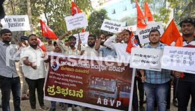 Members of ABVP protesting against the state government for the bus fare hike at KSRTC, Shanthinagar, in Bengaluru on Tuesday 7th January 2025