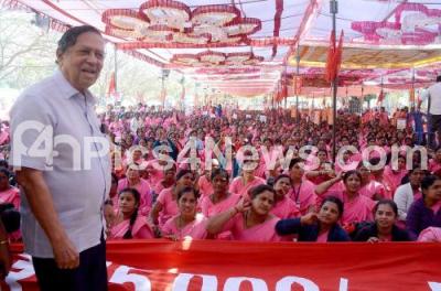 Photo Caption : Former Lokayukta of Karnataka Justice N Santosh Hegde during the members of ASHA (Accredited Social Health Activist) workers in support of AITUC protesting demanding the state and central government fix honorarium of rupees 15000 per month for Asha workers and other demands, at Freedom Park, in Bengaluru on Wednesday 8th January 2025
