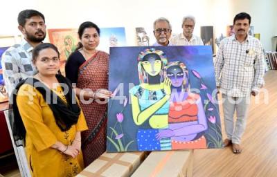 Event Description : Pasakumar, President, Karnataka Lalitha Academy showcasing paintings during the press conference on "Manegondu Kalakruti - Belasi Chitrakale Samskruti" at Karnataka Lalitha Academy, Kannada Bhavan , in Bengaluru on Thursday 9th January 2025