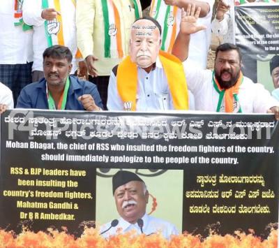 Event Description : Members of Bengaluru City Youth Congress protesting against RSS Chief Mohan Bhagat and Condemns his statement that the country got independence after the construction of Shri Rama Mandir, in Bengaluru on Thursday 16th January 2025
