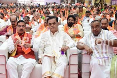 Photo Caption : Union Minister Pralhad Joshi with MLAs Ashwath Narayan, Srinivasatatachar Srivatsa and others during the Brahmana Mahasabha Suvarna Mahotsava program at Palace Grounds, in Bengaluru on Saturday 18th January 2025