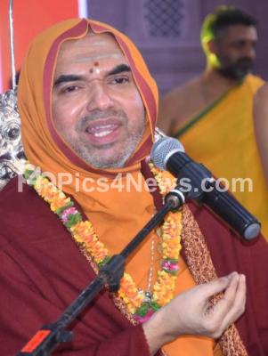 Photo Caption : Raghaveshwara Bharathi Swamiji of Sri Ramachandrapura Mutt addressing during the Brahmana Mahasabha Suvarna Mahotsava program at Palace Grounds, in Bengaluru on Sunday 19th January 2025
