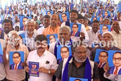 Photo Caption : Members of Samvidhana Samrakshana Maha Vakutta (Constitution Protection Maha Union) protest against demanding the resignation of Central home minister Amith Shah for his remark on Ambedkar, at Freedom Park, in Bengaluru on Monday 20th January 2025