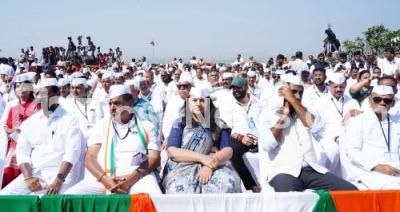Photo Caption : Congress leaders during the unveiling of Mahatma Gandhi statue in front of Suvarna Vidhana Soudha, in Belagavi on Tuesday 21st January 2025