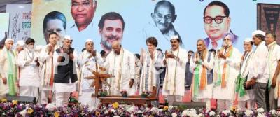 Photo Caption : AICC President Mallikarjuna Kharge with Chief Minister of Karnataka Siddaramaiah, DCM DK Shivakumar, AICC General Secretary Randeep Surjewala, KC Venugopal, Congress MP Priyanka Gandhi, Ministers and others during the "Jai Bapu Jai Bheem Jai Samvidhan" program as part of the centenary of the Belgaum Congress session held under the leadership of Mahatma Gandhiji , at CPD Grounds, in Belagavi on Tuesday 21st January 2025