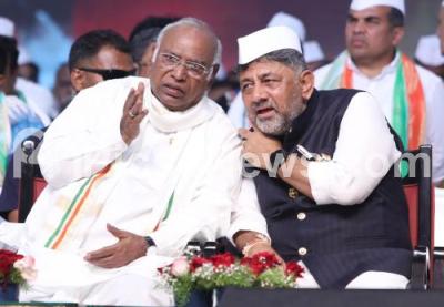 Photo Caption : AICC President Mallikarjuna Kharge and DCM DK Shivakumar during the "Jai Bapu Jai Bheem Jai Samvidhan" program as part of the centenary of the Belgaum Congress session held under the leadership of Mahatma Gandhiji , at CPD Grounds, in Belagavi on Tuesday 21st January 2025