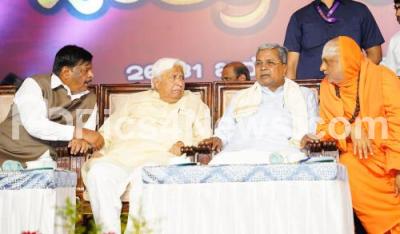 Photo Caption : Chief Minister of Karnataka Siddaramaiah with Shivratri Desi Kendra Swamiji, Ministers HK Patil and HC Mahadevappa during the Jatra Mahotsava of Aadi Jagadguru Sri Shivaratreeshwara Shivayogi at Suttur Mutt, in Mysuru on Friday 31st January 2025