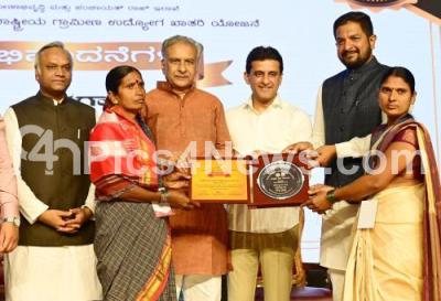 Photo Caption : Council Chairman Basavaraj Horatti presenting Best award for the achievers institutions under the NREGA scheme, at Ambedkar Bhavan, also seen are Rural Development and Panchayat Raj Minister Priyank Kharge, MLAs Rizwan Arshad, Sharath Bachegowda and others, in Bengaluru on Wednesday 5th February 2025