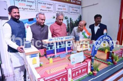 Photo Caption : Council Chairman Basavaraj Horatti with Rural Development and Panchayat Raj Minister Priyank Kharge, MLA Sharath Bachegowda looking at the models of NREGA projects during the Best award presentation ceremony for the achievers institutions under the NREGA scheme, at Ambedkar Bhavan, in Bengaluru on Wednesday 5th February 2025