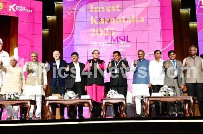 Photo Caption : Union Minister V Somanna, DCM DK Shivakumar, MP Shashi Tharoor, Council Chairman Basavaraj Horatti, Minister MB Patil during the "Invest Karnataka 2025" valedictory program at Palace Grounds, in Bengaluru on Friday 14th February 2025