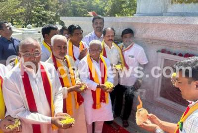 Photo Caption : Minister RB Thimmapur flagged off the Rannaratha of poet Chakravarthy Ranna Vaibhav in front of the statue of Nadadevi Bhuvaneshwari at Vidhana Soudha premises, in Bengaluru on Wednesday 19th February 2025