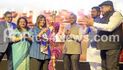 Photo Caption : Minister for Rural Development ,Panchyat Raj and IT and BT Priyank Kharge with Founder of Biocon Kiran mazumdar Shaw, MLA Sharath Bache Gowda, Dr Ekroop Caur IAS Dept of Electronics during the inauguration of Bengaluru GAFX at Lalith Ashok, in Bengaluru on Thursday 27th February 2025