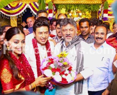 Photo Caption : DCM DK Shivakumar greeted the newlywed MP Tejasvi Surya and Shivashri Skanda Prasad during their wedding reception at the Palace Grounds, in Bengaluru on Sunday 9th March 2025