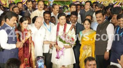 Photo Caption : Former Chief Minister of Karnataka BS Yeddiyurappa and BJP state President BY Vijayendra greeted newlywed MP Tejasvi Surya and Shivashri Skanda Prasad during their wedding reception at the Palace Grounds, in Bengaluru on Sunday 9th March 2025