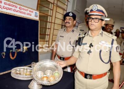 Photo Caption : Police Commissioner B Dayananda inspects the recovered jewels during the press conference on Property parade at Police Commissioner office, in Bengaluru on Friday 14th March 2025