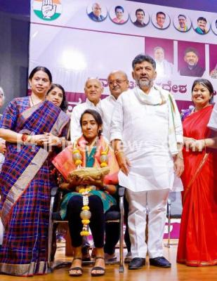 Photo Caption : Ananya Prasad, granddaughter of national poet G.S. Shivarudrappa, who rowed alone in the Atlantic Ocean for 4800 km in 52 days, felicitated on the occasion of International Women Day celebrations at KPCC office, also seen are KPCC President and DCM DK Shivakumar, KPCC Mahila Morcha President Sowmya Reddy, Minister Lakshmi Hebbalkar and others, in Bengaluru on Saturday 15th March 2025