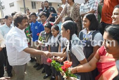 Photo Caption : Primary and Secondary Education Minister Madhu Bangarappa greetingSSLC students before their exam at an Exam Centre, Karnataka government is conducting the SSLC exams statewide from March 21, in Bengaluru on Friday 21st March 2025