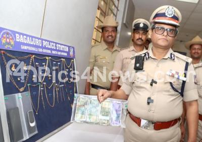 Photo Caption : Police commissioner Dayananda B inspects the seized jewels and cash during a press conference on property parade at Police commissioner office, in Bengaluru on Friday 28th March 2025