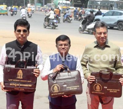Photo Caption : BBMP Special Commissioner Harish Kumar with BBMP Administrator SR Umashankar and BBMP Commissioner Tushar Girinath before presenting BBMP 2025 - 2026 budget at Town Hall, in Bengaluru on Saturday 29th March 2025