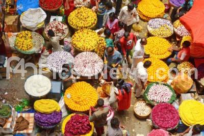 Photo Caption : People shopping flowers, mango and neem leaves for the Ugadi festival at KR market, in Bengaluru on Saturday 29th March 2025