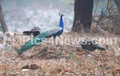 Peacocks searching for the water at Ullal lake near Ramasandra Village, Vishveshwaraiah layout, the water level has decreased at Ullal lake and is drying drastically due to summer season, in Bengaluru on Sunday 6th April 2025