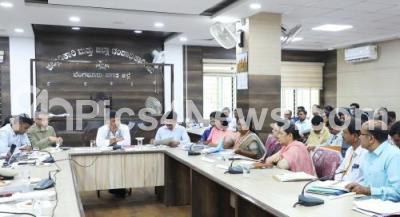 Photo Caption : DCM DK Shivakumar with District Magistrate Jagadish, BBMP Chief Commissioner Tushar Girinath, BWSSB Chairman Ram Prasat Manohar, DCM Secretary Rajendra Cholan and others during the progress review meeting at the Bangalore City District Magistrate office, in Bengaluru on Monday 7th April 2025