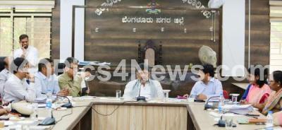 Photo Caption : DCM DK Shivakumar with District Magistrate Jagadish, BBMP Chief Commissioner Tushar Girinath, BWSSB Chairman Ram Prasat Manohar, DCM Secretary Rajendra Cholan and others during the progress review meeting at the Bangalore City District Magistrate office, in Bengaluru on Monday 7th April 2025