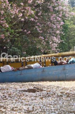 Photo Caption : People napping on the wall under the tree shadow at Freedom Park during hot afternoon summer, in Bengaluru on Tuesday 8th April 2025