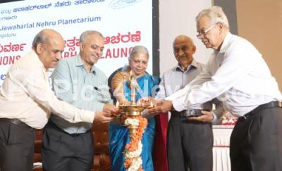 Photo Caption : Dr. BR Guruprasad, Director, JNP with AS Kiran Kumar, Member, Space Commission and Chairman, BASE Council, Dr. Annapurni Subramaniam, Director, Indian Institute of Astrophysics and others during the golden jubilee celebration of "Aryabhatta Launch" at Nehru Planetarium, in Bengaluru on Saturday 19th April 2025