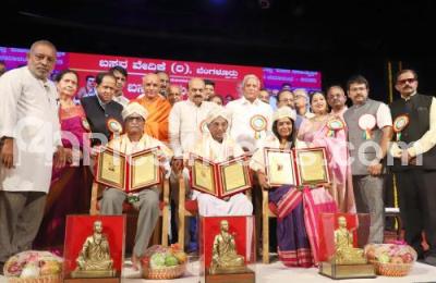 Photo Caption : Senior writer Go.Ru. Channabasappa honored with "Basavashree Award" and Play Back Singer MD Pallavi and Founder of BLDE Institute, FG Halakatti Research Institute honored with "Vachanashri Award" during the Basava Jayanti and Basavashree and Vachana Sahitya Shri award presentation ceremony organized by Basava Vedike Bangalore at Ravindra Kalakshetra, also seen are Union Minister V Somanna, Former Chief Minister and MP Basavaraj Bommai, Sri Nirmalanandanath Swamiji, of Adichunchanagiri Mutt, Basava Vedike President Dr. C. Somashekar, Vice President Shadakshari and others, in Bengaluru on Saturday 3rd May 2025