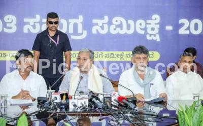 Photo Caption : Chief Minister of Karnataka Siddaramaiaha addressing a press conference after the meeting on the survey on internal reservation for Scheduled Communities at Conference Hall, Vidhana Soudha, also seen are DCM DK Shivakumar, Ministers KH Muniyappa, HC Mahadevappa, Shivaraj Thangadgi and Chief Secretary Dr. Shalini Rajneesh, in Bengaluru on Monday 5th May 2025