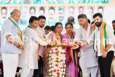 DCM and KPCC President DK Shivakumar with Minister Ramalinga Reddy, State President of the Guarantee Schemes Implementation Committee HM Revanna, Former MP DK Suresh, MLAs Iqbal Hussain, HC Balakrishna, CP Yogeshwar, Dr Ranganath, MLC S Ravi, Congress leader BV Srinivas, State President Manjunath Gowda, District President Chandru Sagar, Youth Congress district in-charge Parumita and others during the "Ramanagara District Yuva Parva" (Youth Festival Convention), in Ramanagar on Sunday 11th May 2025