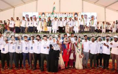 Photo Caption : Newly elected office bearers of Ramanagara District Youth Congress take oath in the Presence of DCM and KPCC President DK Shivakumar during the "Ramanagara District Yuva Parva" (Youth Festival Convention) , also seen are Minister Ramalinga Reddy, State President of the Guarantee Schemes Implementation Committee HM Revanna, Former MP DK Suresh, MLAs Iqbal Hussain, HC Balakrishna, CP Yogeshwar, Dr Ranganath, MLC S Ravi, Congress leader BV Srinivas, State President Manjunath Gowda, District President Chandru Sagar, Youth Congress district in-charge Parumita and others, in Ramanagar on Sunday 11th May 2025