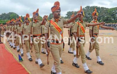 Photo Caption : Police personnel march past during DG and IGP Commendation DISC investiture Ceremony and Farewell Parade at Koramangala KSRP grounds, in Bengaluru on Wednesday 21st May 2025