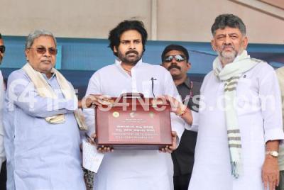 Chief Minister of Karnataka Siddaramaiah with DCM DK Shivakumar, AP DCM Pawan Kalyan and others during the handover 6 Kumki elephants to Andhra Pradesh state at Vidhana Soudha, in Bengaluru on Wednesday 21st May 2025