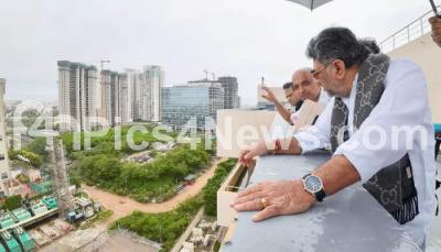 Photo Caption : DCM D K Shivakumar inspected the Rajakaluve and canals around Manpho and Embassy, near Yelahanka Manyata Tech Park, where rain waterlogged and flooded due to recent rains, in Bengaluru on Thursday 29th May 2025