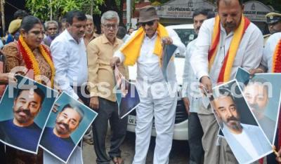 Event Description : Members of Kannada Chaluvali Vatal Paksha led by its President Vatal Nagaraj tore and burnt the portrait of Multilingual actor Kamal Hasan for his statement on Kannada language, in Bengaluru on Thursday 29th May 2025