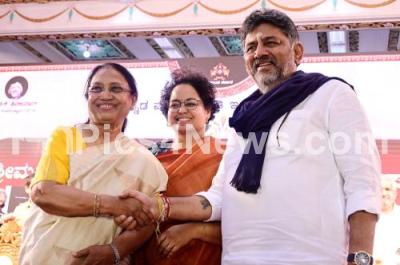 Photo Caption : International Booker Prize winners Banu Mushtaq and Deepa Bhasthi being felicitated during a felicitation ceremony organized by the Kannada and Culture Department at the Banquet Hall of Vidhana Soudha, also seen is DCM DK Shivakumar, in Bengaluru on Monday 2nd June 2025